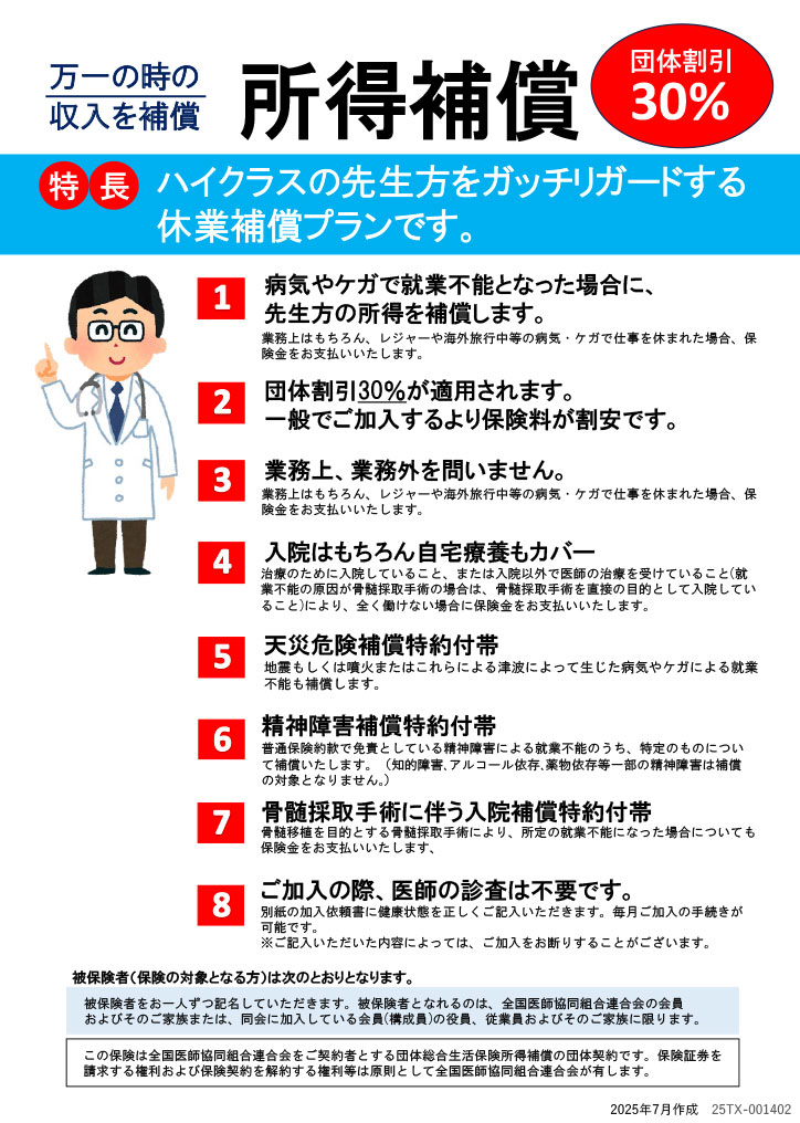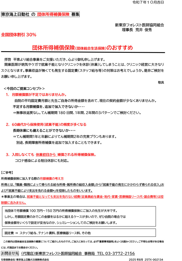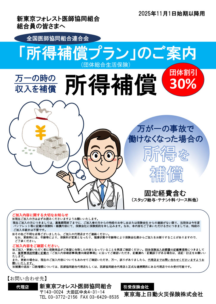 11月1日満期/東京海上日動社の所得補償・団体長期障害所得補償・介護補償の3種ご案内スタートします。 先生がコロナ感染し自宅療養就業不能の際(短期間休診)にでも免責日数ゼロ日でお支払いいたします。 公開済み: 2025年10月1日更新: 2025年10月6日作成者: o-ikyoカテゴリー: 未分類